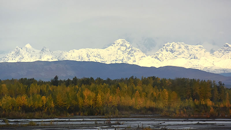 タルキートナ手前からデナリ国立公園の白い山々が見えてきます。