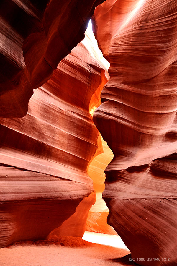 でっかくはないものの運良くビームにお目にかかれた。すかさずガイドは写真のように砂をすくって上に撒き上げる。ちょうど手前にフォトツアーのグループが三脚を立てての撮影中でした。なのでビーム周辺は人払いがしてある。これでSS 1/25 F2.5となり、SSが下がって来た。奥へ進むほど暗さが増している。